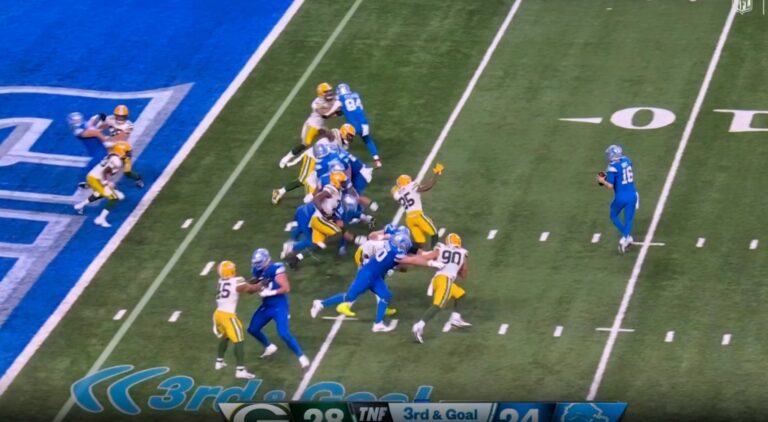 With the Lions trailing 28-24 in the fourth quarter, Jared Goff found Tim Patrick in the end zone on third and goal for the go-ahead touchdown.