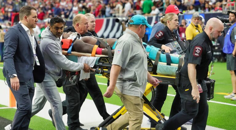The wide receiver sustained a scary hit during Miami’s loss to the Houston Texans on Sunday and had the entire stadium worried after medics cut his jersey off to strap him to a stretcher during a lengthy delay following the hefty tackle.