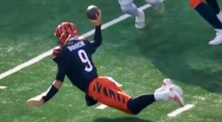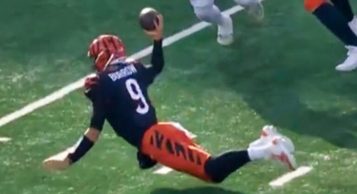 While falling to the ground, Burrow finished his throw and release as the bottom half of his body was lying on the turf.