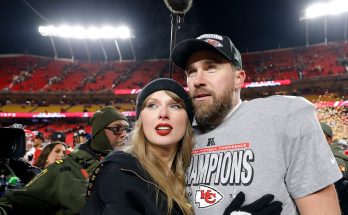 Kelce wore a version of the iconic “I Can Do It With a Broken Heart” costume he debuted onstage during Swift’s London Eras Tour show in June. The sleek black suit with tails evoked a timeless elegance, punctuated by details that tied perfectly into the evening’s celebratory theme.