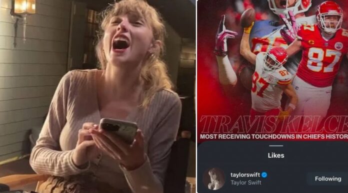 Taylor liked a post from the @Chiefs account that said, “If you ever can’t find Travis, chances are he’s in the end zone. Congrats, @killatrav!”