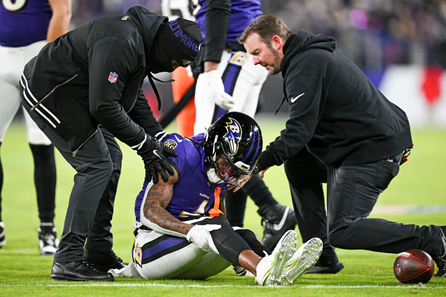 Zay Flowers exited early in the Ravens’ 35-10 blowout win over the Browns in the teams’ regular-season finale with a right knee injury.
