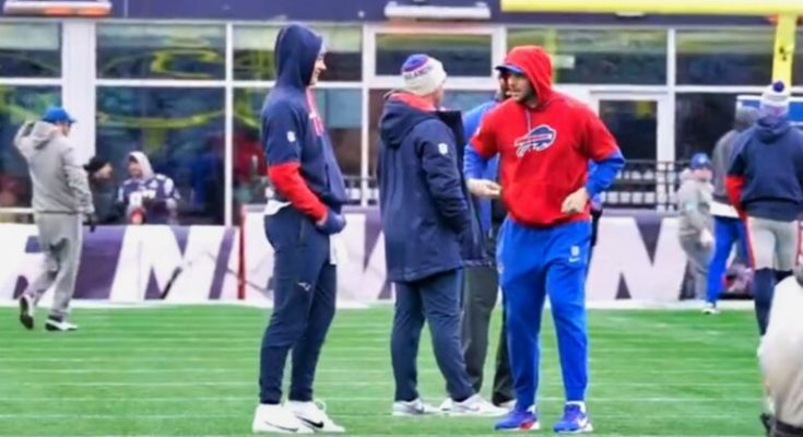 Josh Allen appears to be coaching up Drake Maye before the game.