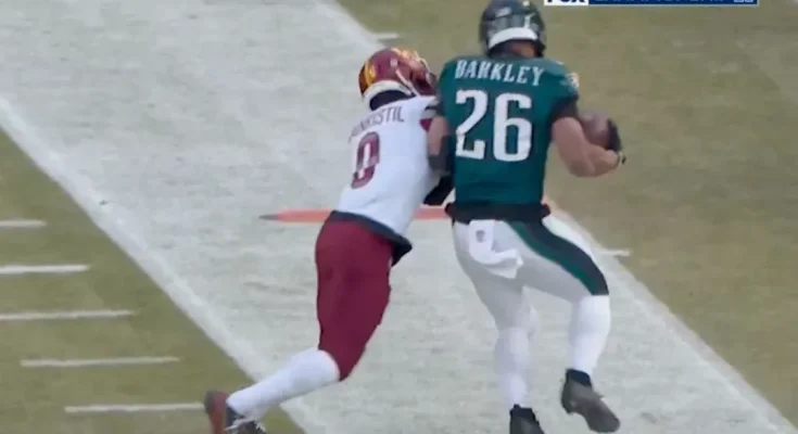 Saquon Barkley was all over the place for the Philadelphia Eagles in the first half of the NFC championship game against the Washington Commanders. He scored two touchdowns in the first quarter and, late in the first half, even managed to draw a penalty to give his team a huge advantage.