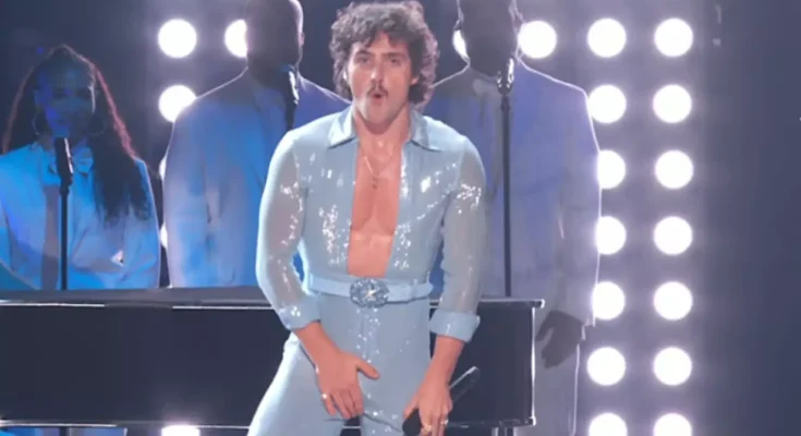 Benson Boone and his skintight jumpsuit performing at the Grammys (Kevin Mazur/Getty Images)