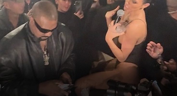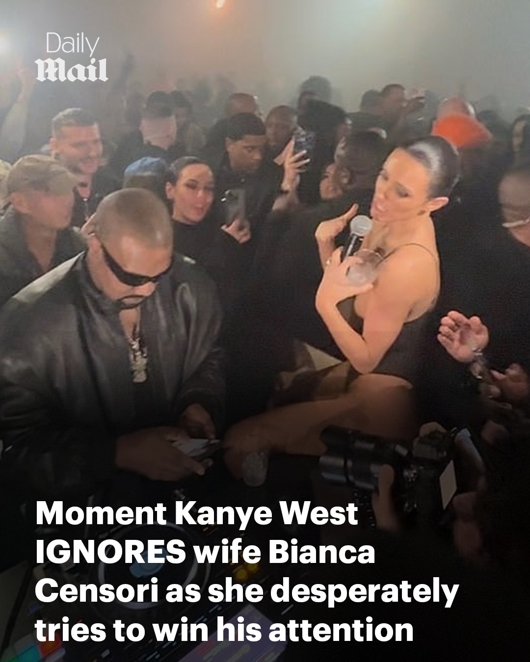 Forgoing her bra and underwear beneath a very sheer black bodysuit, from Kanye’s own womenswear collection, Bianca, 30, was seen singing her heart out and dancing as she tried to garner Kanye’s attention.