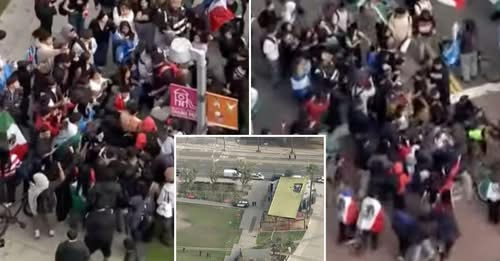 The protest collapsed into chaos and violence just after 1:30 p.m. when the fights broke out, the Los Angeles Police Department said.