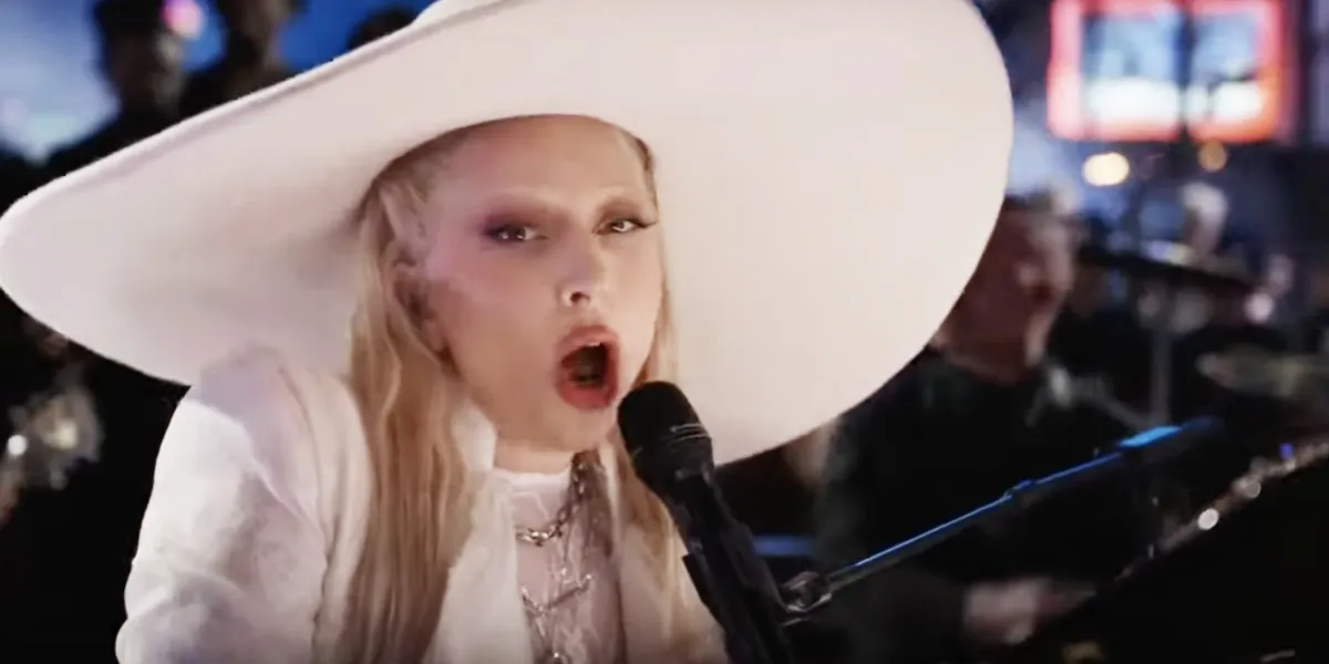 A closer look at Lady Gaga singing “Hold My Hand” on Bourbon Street, New Orleans | Source: YouTube/NFLonFOX