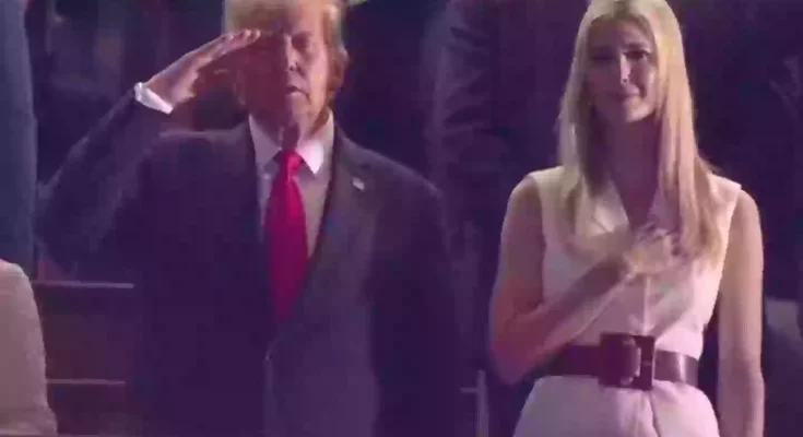 Donald Trump saluted as the national anthem was being sang (Fox)