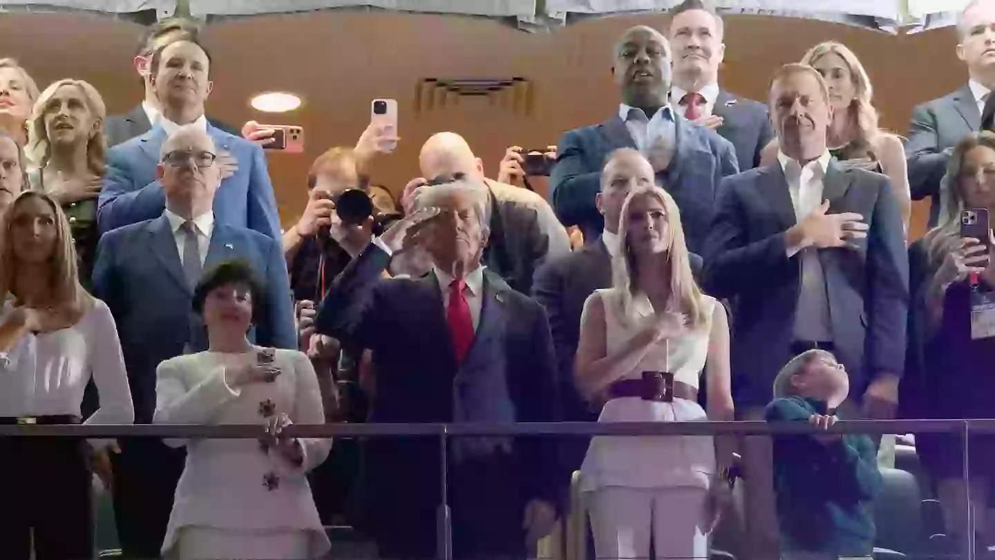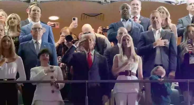 During the national anthem, the president could be seen doing a salute while others around him, including his daughter Ivanka, put their right hand over their heart.