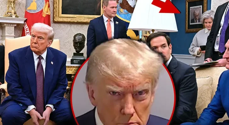 The door to the Oval was left open, and just outside the office, you can see a framed photo of Trump’s infamous mug shot hanging on the wall.