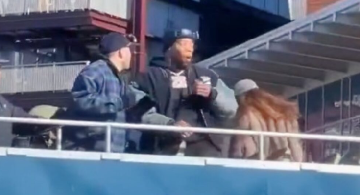 At Super Bowl parades, it’s common for fans to throw canned drinks for the players to catch while they ride the team bus. But Saquon Barkley missed this dart from a fan, and it wound up doinking the back of the head of a person standing behind him: