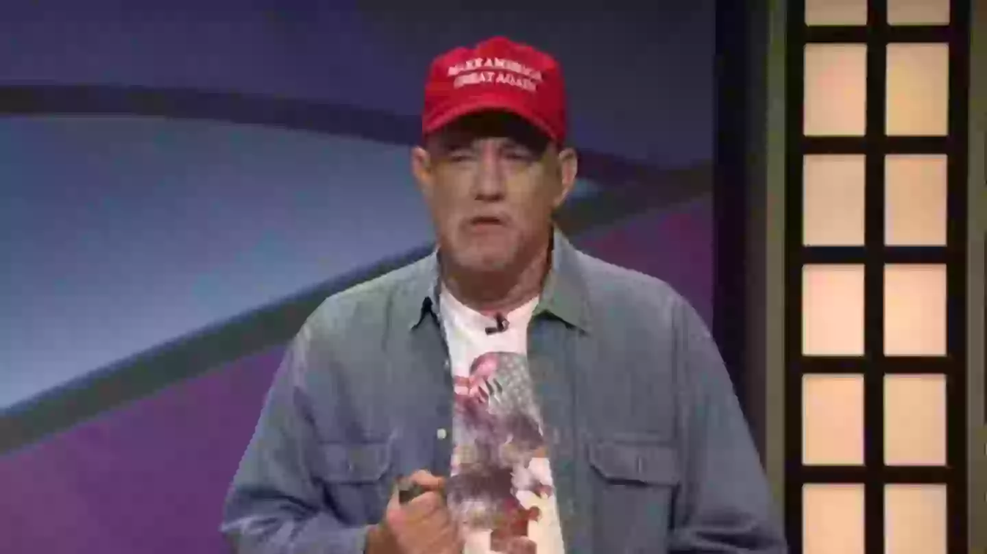 The Forrest Gump actor donned a red ‘Make America Great Again’ cap as he played a man named Doug on a parody game show known as Black Jeopardy.