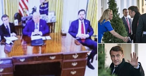 Images have also revealed Macron in the corner of his Oval Office desk during a Zoom call with world leaders – while Trump sat in the middle