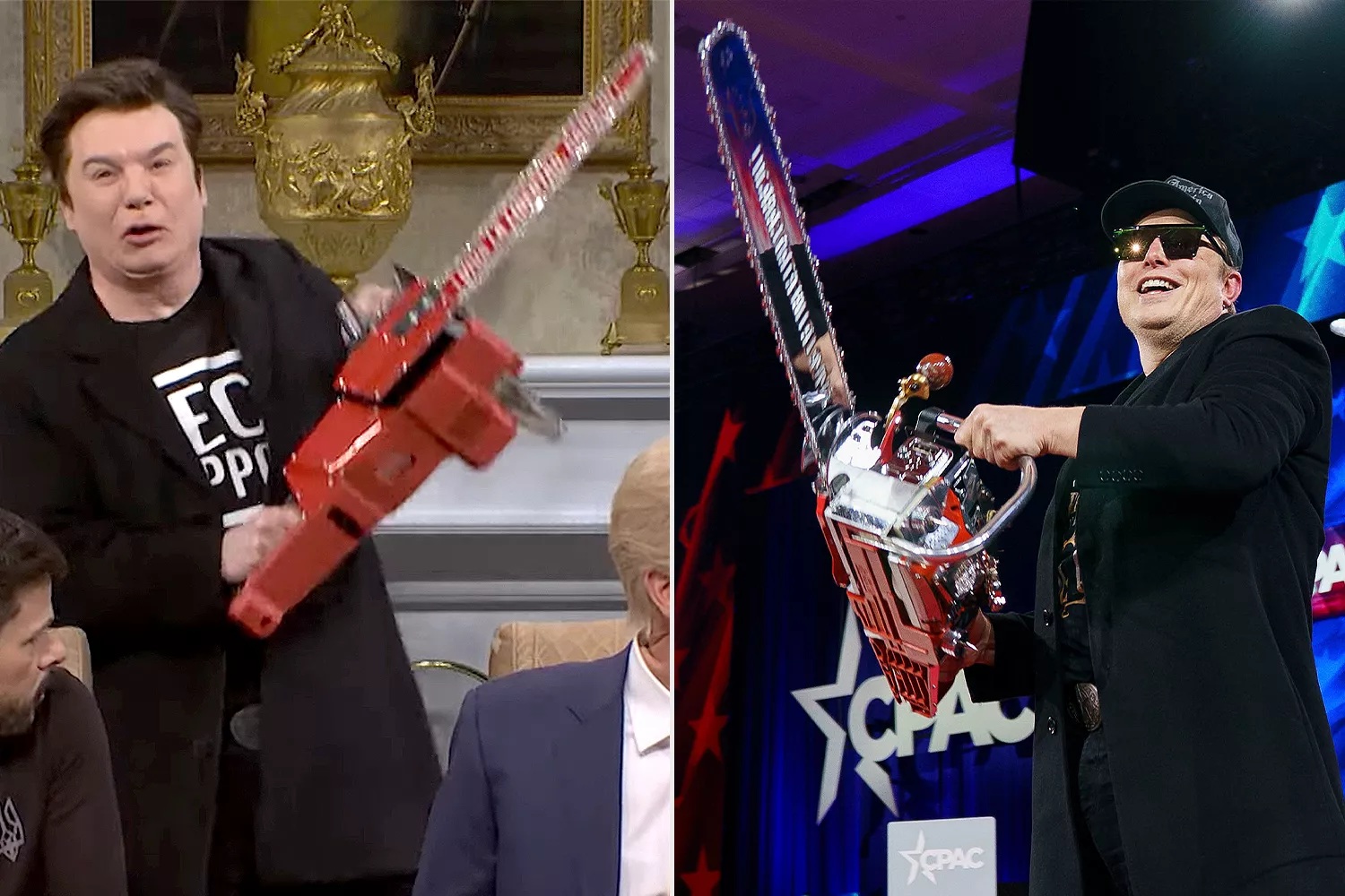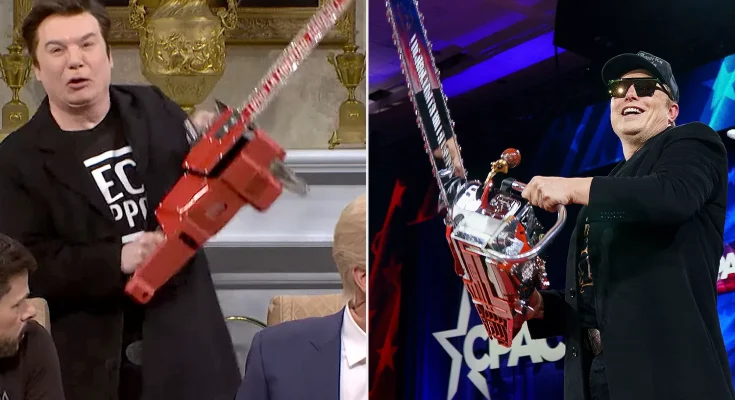 Myers then appeared as Musk, dressed in jeans, a black coat and a “Tech Support” printed T-shirt while holding up a chainsaw. “Hi guys,” Myers said while stuttering, before Johnson responded, “Elon, we love your outfit. Very official and respectful.”