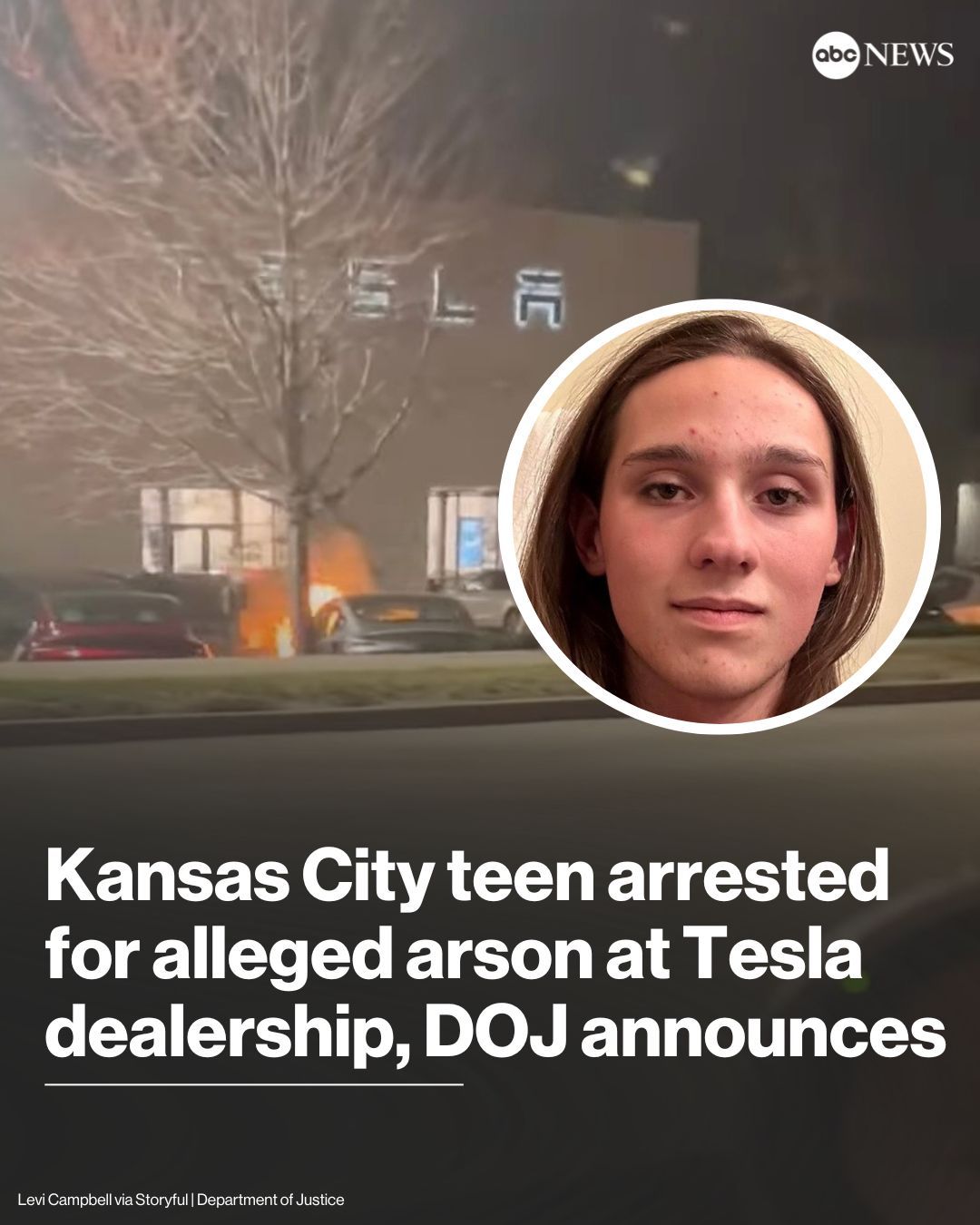 A 19-year-old Kansas City, Missouri, resident was arrested for allegedly burning Tesla vehicles last month, the Justice Department announced on Friday.
