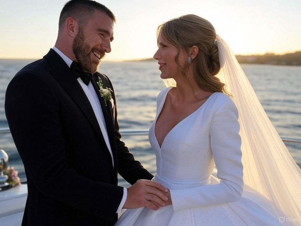 Taylor stunned in a custom couture gown—a sleek, vintage-inspired silhouette with delicate lace and crystal beading, reminiscent of her Lover album era. Travis looked dashing in a tailored tux that gave a nod to his football roots, featuring subtle stitching in Kansas City Chiefs’ red and gold hues.