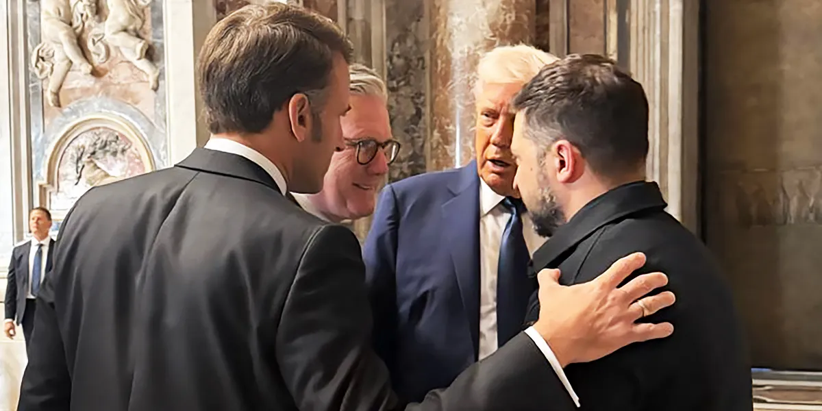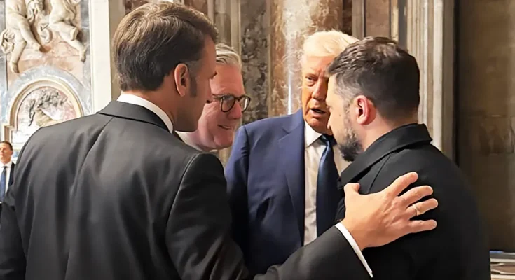 French President Emmanuel Macron, British Prime Minister Keir Starmer, U.S. President Donald Trump, and Ukrainian President Volodymyr Zelenskyy at Pope Francis’ funeral at St. Peter’s Basilica in Vatican City, Vatican on April 26, 2025. | Source: Getty Images