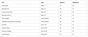 Emerson College also released a poll last week, which showed that Trump’s approval rating had dropped marginally, from 47 percent to 45 percent, since March, while his disapproval rating remained the same at 45 percent. The most recent poll was conducted April 25-28 among 1,000 registered voters and had a margin of error of +/- 3 percentage points.