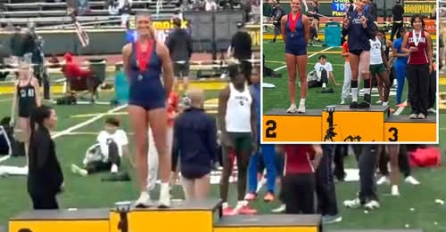 Junior trans athlete AB Hernandez of Jurupa Valley (center) — who won titles in the girls’ long jump and triple jump — posed with competitors to take pictures on the podium.X / @Riley_Gaines_