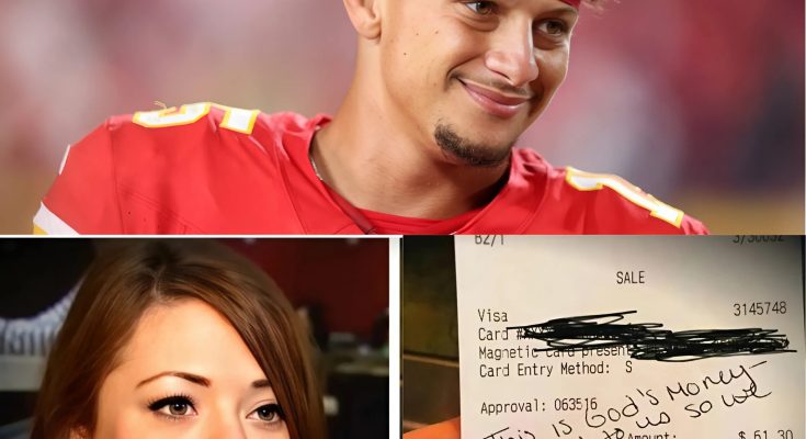 Lily, a 24-year-old waitress working double shifts at a small-town diner, never imagined that an ordinary Tuesday evening would turn into the most unforgettable night of her life. The restaurant buzzed with the usual noise of plates clinking and casual conversations, but one customer sat quietly in the corner booth — calm, respectful, and low-key. He wore a baseball cap pulled low and kept to himself, offering a kind smile every time Lily came by. She had no idea that she was serving NFL superstar Patrick Mahomes, one of the most recognizable faces in football.