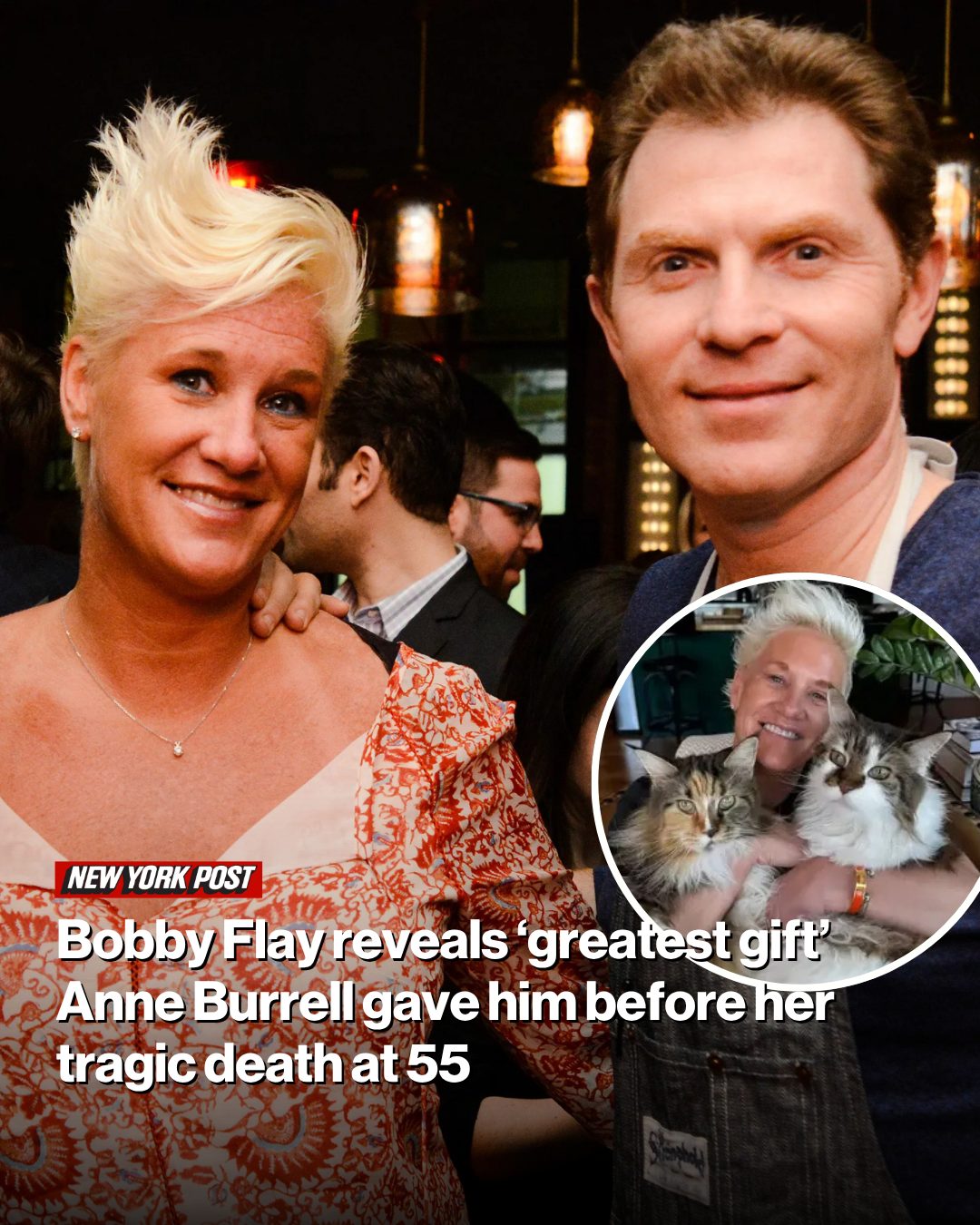 Flay’s tribute featured a picture of Burrell holding two Calico Maine Coon cats.