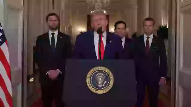 Trump seen addressing the nation in wake of the strikes alongside JD Vance (left) Marco Rubio and Pete Hegseth (Carlos Barria – Pool/Getty Images)
