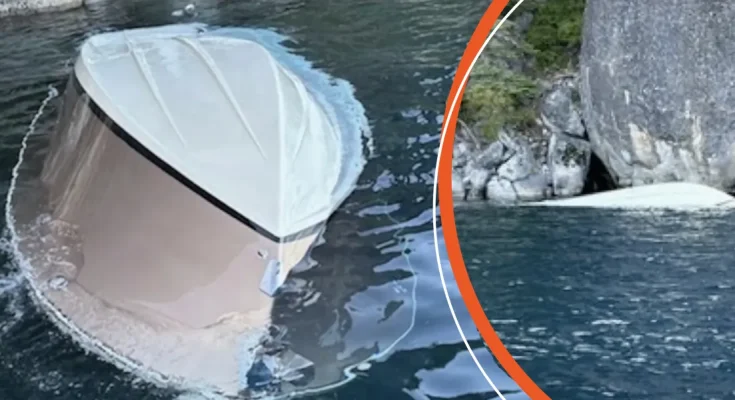 The overturned boat seen near the rocky shoreline of D.L. Bliss State Park on Lake Tahoe, as posted on June 21, 2025 | Source: YouTube/abc7news