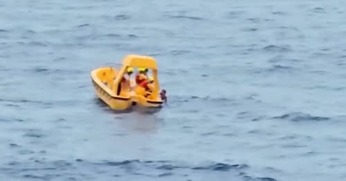 Dramatic footage shows the rescue crew from the Disney Dream using a small yellow boat to pull the pair from the water.