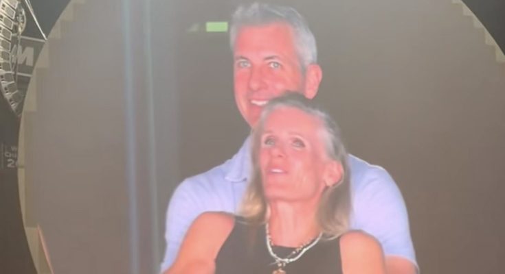 Grace Springer, 28, was recording from the crowd when Andrew Byron and Kirstin Cabot appeared on the big screen together at Boston’s Gillette Stadium on Tuesday.