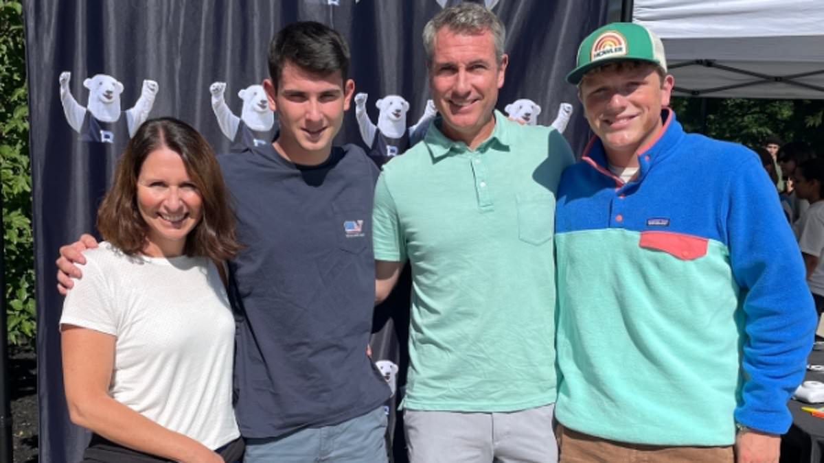 In the hiking photo, both parents and their two children all have their arms around each other as they grin for the camera in front of a creek.