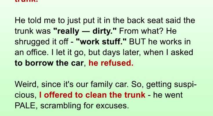 So, getting suspicious, I offered to clean the trunk — he went PALE, scrambling for excuses.