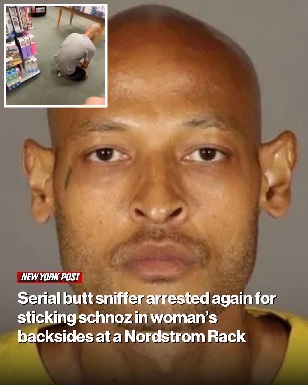 A notorious butt-sniffing freak was thrown behind bars again after he was allegedly caught putting his schnoz near the backside of an unsuspecting woman at a Nordstrom Rack in California.