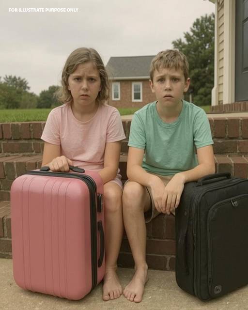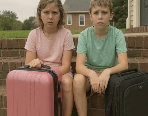 There they were—my children, sitting quietly on the front steps, backpacks and little rolling suitcases beside them. Ella, my youngest, was holding her stuffed panda, staring out at the street like she was waiting for a ride. My son, Max, just ten years old, looked up as my car pulled in, confusion clouding his face.