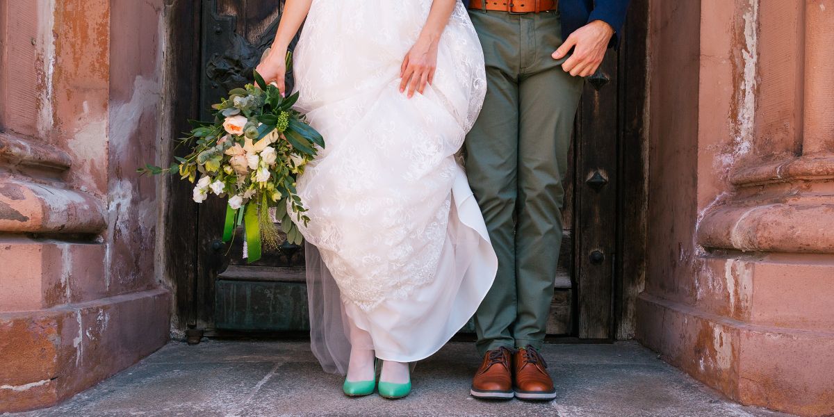 A bride and groom standing at the church entrance | Source: Shutterstock