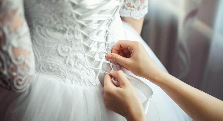 A bridesmaid making a knot on a bride’s dress | Source: Shutterstock