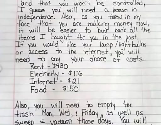 In her letter, she directly addressed her 13-year-old son, criticizing him for treating her as a “roommate” instead of a parent.