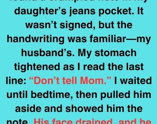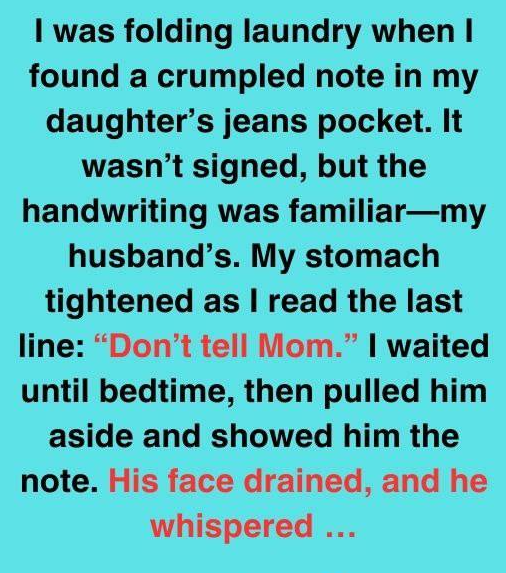 While doing laundry, I found a crumpled note in the pocket of my daughter’s jeans. It wasn’t signed, but I recognized my husband’s handwriting instantly. The last line made my stomach knot: “Don’t tell Mom.” That night, after the kids were asleep, I showed him the note. His face went pale. “It’s not what you…