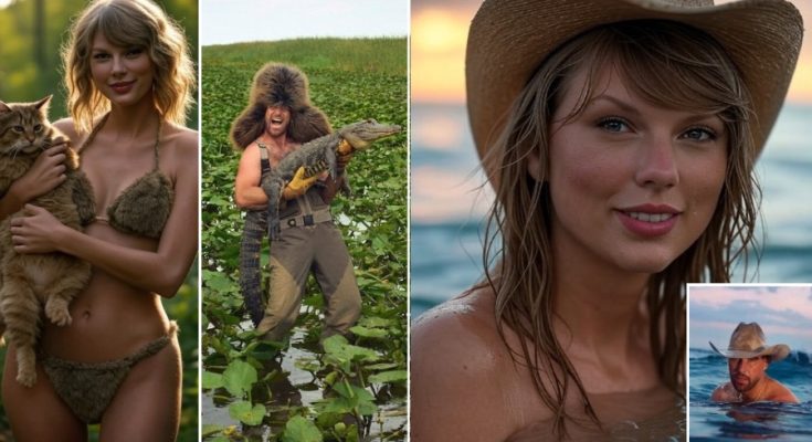 The fashion spread, captured by photographer Ryan McGinley and styled by Law Roach, is a daring visual narrative. Kelce channels “swamp chic” in Florida’s Everglades, draped in head-to-toe fur, Etro hats, Dolce & Gabbana coats, and Lu’u Dan pants—bare-chested and bold. Even more unforgettable: a live alligator cradled in one arm and a monumental Hermès Birkin bag in the other. Elsewhere, he surfaces from swamp waters wearing only a cowboy hat, or visits danger in a neon CAT Workwear vest.