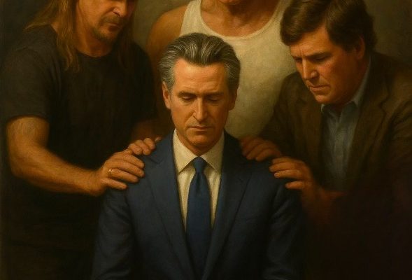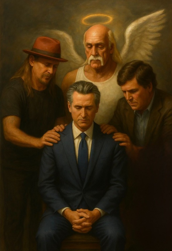 Newsom has been embracing a chaotic social media style like Trump’s, posting viral memes and humorous photos, including an AI-generated image of Hulk Hogan, Kid Rock, and Tucker Carlson praying over him.