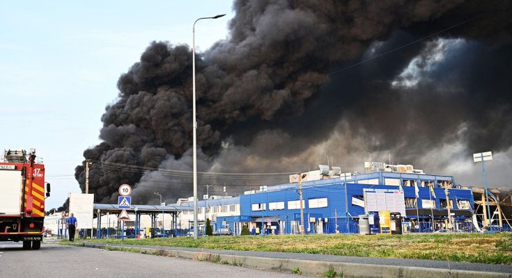 Black smoke rises from the electronics manufacturing company as firefighters continue to extinguish the fire after the Russian army hit a large American company producing civilian electronics with two missiles in Mukachevo, Zakarpattia region of Ukraine on Aug. 21, 2025. (Zakarpattia Regional Military Administration/Handout/Anadolu via Getty Images)