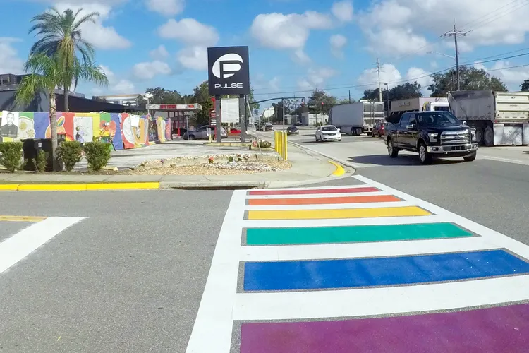 The crosswalk is on Orange Avenue in Orlando, Florida, right next to the abandoned club that still stands as a memorial to the lives lost.