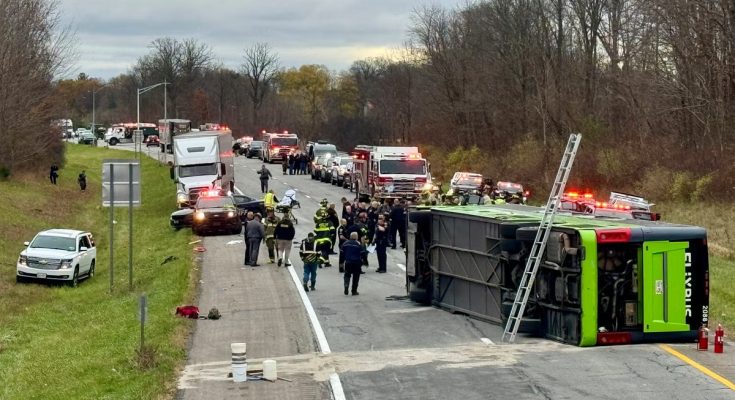 A tragic accident unfolded this afternoon along Interstate 90 in Pembroke, near Buffalo, New York, after a tour bus carrying more than 50 passengers overturned, resulting in what authorities are calling a “mass casualty” incident.
