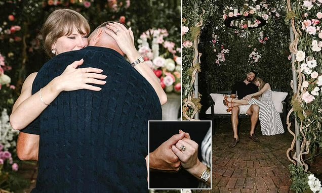 In the romantic pictures, Kelce is seen kneeling amid a sea of flowers, presenting Swift with a dazzling diamond ring designed by Kindred Lubeck of Arifex Fine Jewellery. Estimated to cost up to $1 million, the sparkler glistened as Swift captioned the post with a playful nod to her fans: “Your English teacher and your gym teacher are getting married.”