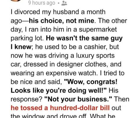 Just a month after the separation, Katherine saw Michael flaunting luxury: stepping out of a sleek sports car, wearing designer clothes. This was a man who once struggled to pay bills. He handed her a $100 bill mockingly, calling it a “parting gift.” Katherine froze when she noticed a small blue smiley face drawn on the corner — a personal symbol from years ago.