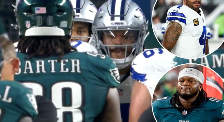 After the NBC broadcast eventually showed footage of Dak Prescott spitting first, former Cowboys coach and current NBC host Jason Garrett said on the postgame show that Carter thought the quarterback spat at him before the first play of an eventual 24-20 Eagles win in Philadelphia.