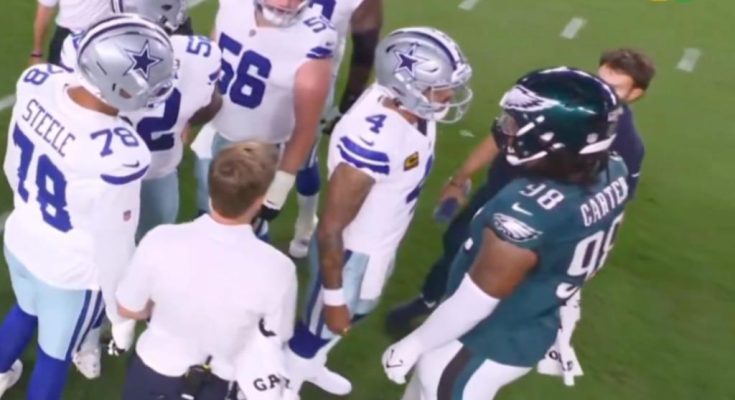 With Philadelphia trainers addressing an injury after the opening kickoff, Carter, the star defensive lineman, walked up to Cowboys quarterback Dak Prescott and proceeded to spit on his chest.