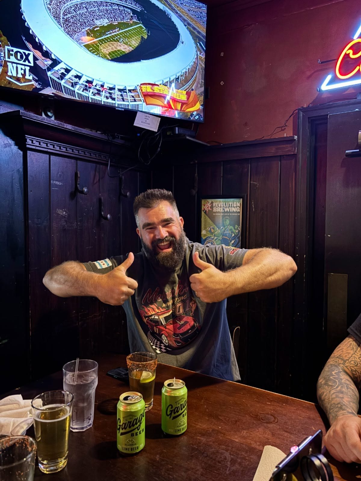 Jason Kelce enjoyed some chicken wings as he watched football in action, and he washed down the meal with Garage Beer; both Jason Kelce and Travis Kelce own the brand.