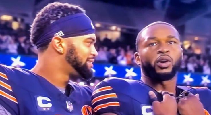 Prior to the start of the game, the Bears quarterback was shown giggling and speaking with a teammate during Jim Cornelison’s rendition of the national anthem, something which got folks riled up after it went viral on Twitter/X.