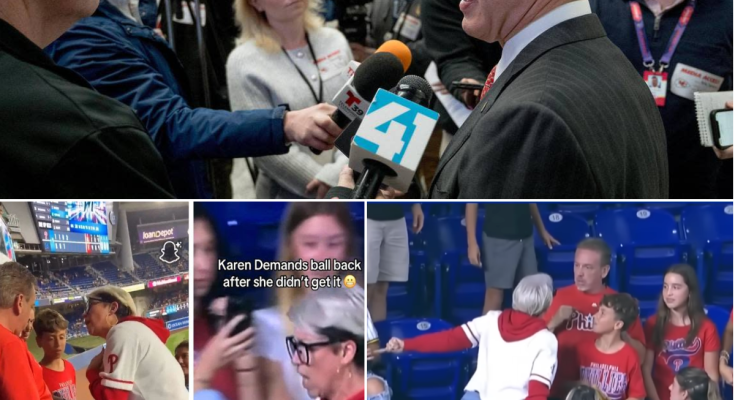 The heart-wrenching incident unfolded during a recent Phillies game when the father and son were harassed by a woman—now known as “Phillies Karen”—who pressured them into surrendering the cherished baseball. The moment quickly went viral, with social media flooded with outrage over the bullying behavior, sparking a wider conversation about respect and sportsmanship in the fan community.